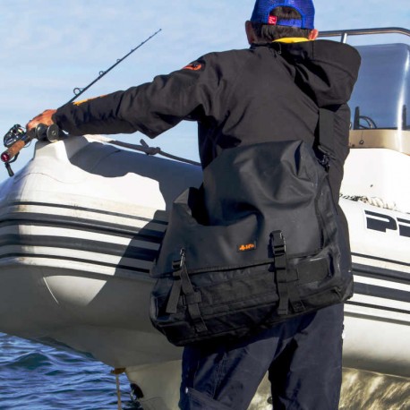 The DRY RIB BAG is a large waterproof bag that can be worn over the shoulder and can be attached inside a boat thanks to the straps with clips and rings located on the back side.